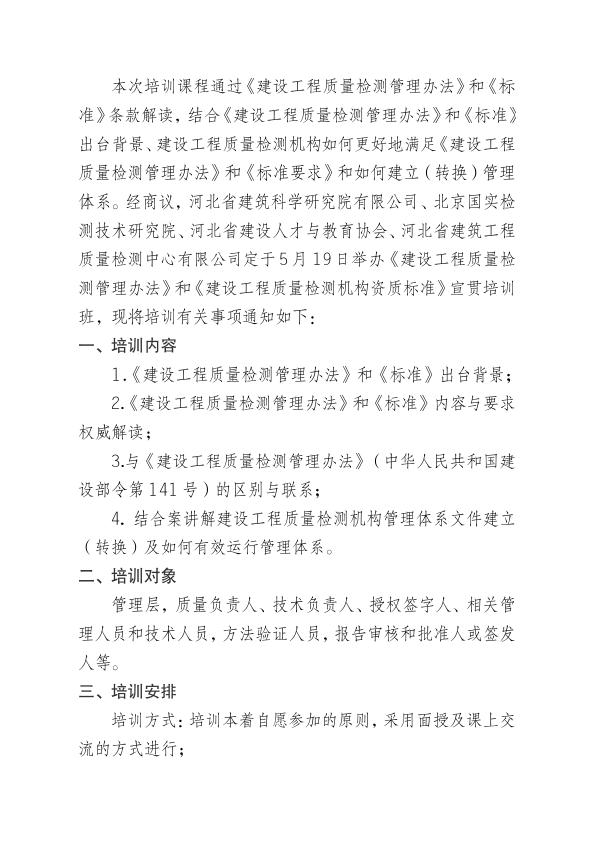 關于《建設工程質量檢測管理辦法》和《建設工程質量檢測機構資質標準》宣貫培訓班的通知