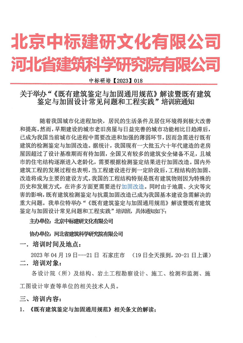 關(guān)于舉辦“《既有建筑鑒定與加固通用規(guī)范》解讀暨既有建筑鑒定與加固設(shè)計常見問題和工程實踐”培訓班的通知