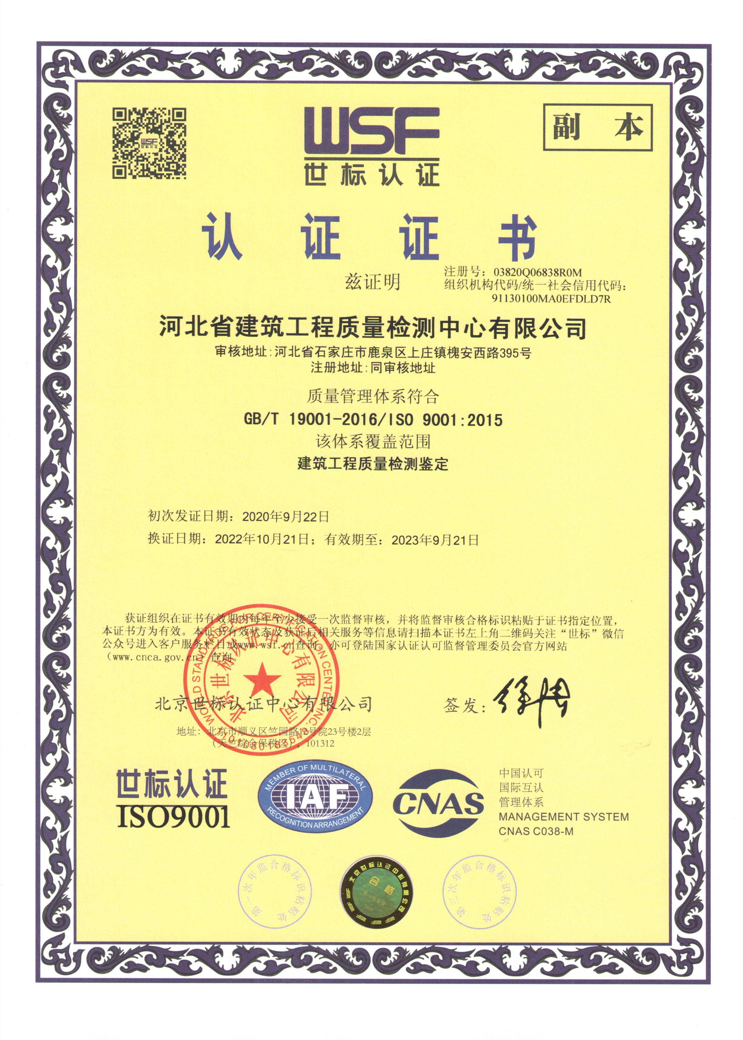 河北省建筑工程質(zhì)量檢測中心認證證書2