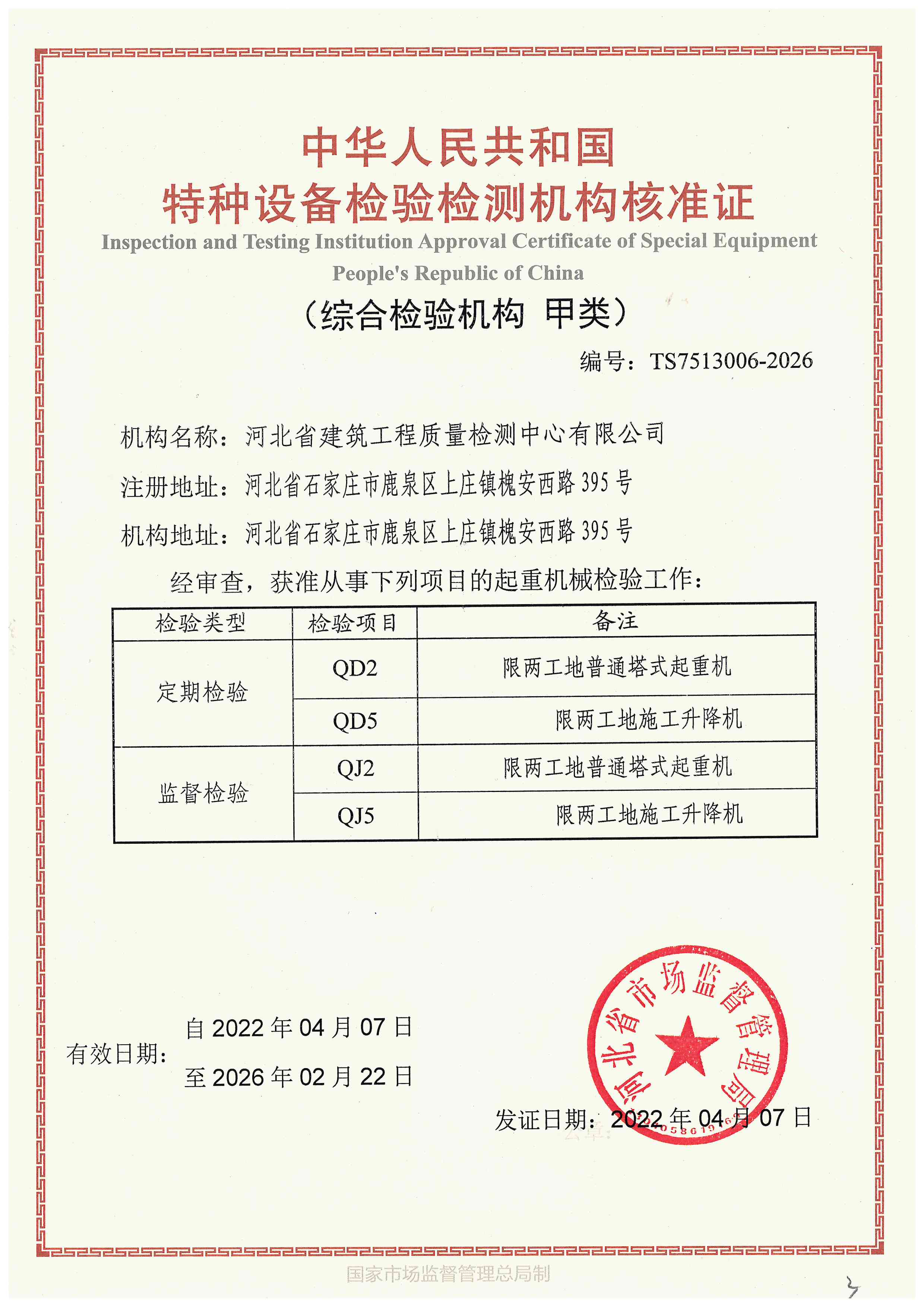 河北省建筑工程質(zhì)量檢測中心特種設備檢驗檢測機構(gòu)核準證